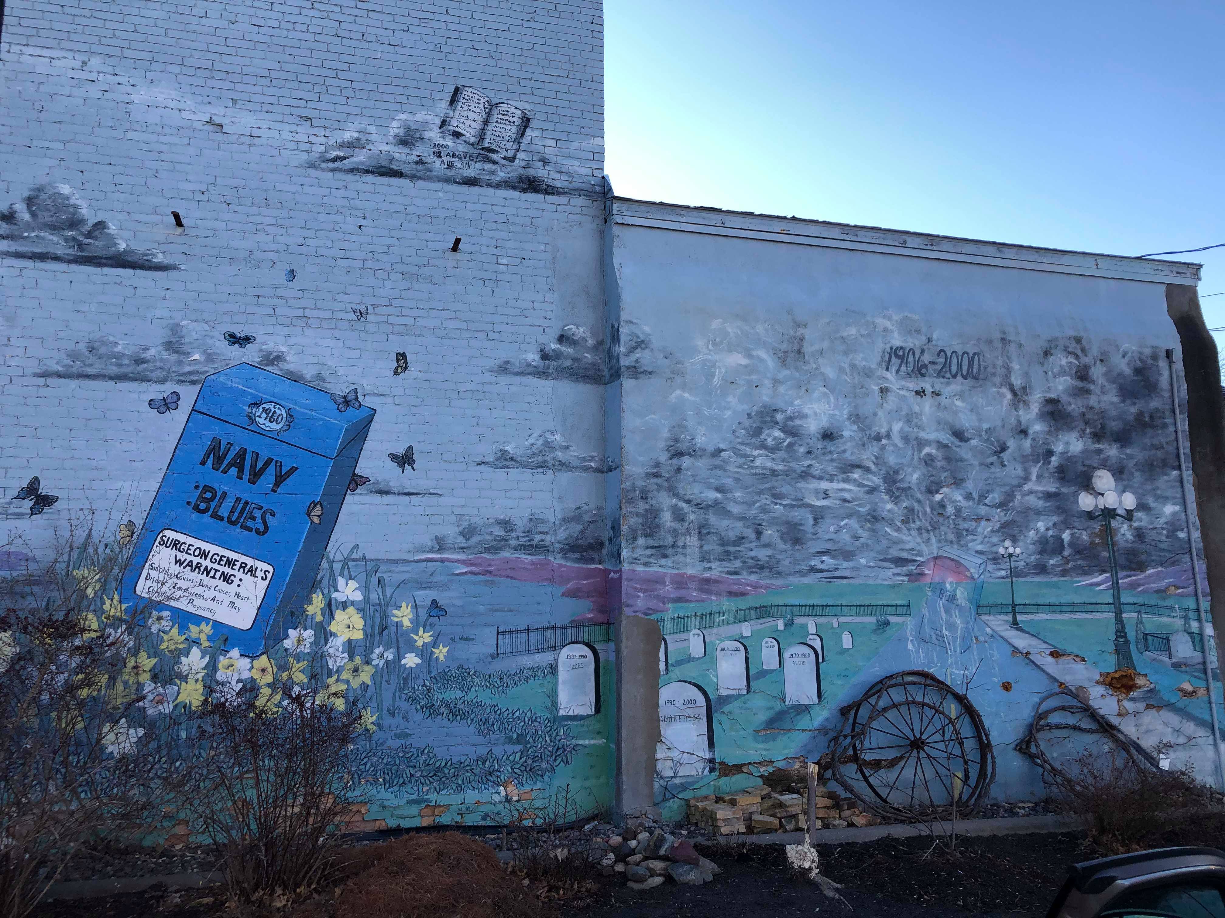 To accomplish that, Frank Gosiak was put in charge of the project. It was commissioned in 2000 by the Freshwater Education District, and 11 students at the time gave the mural new life, and added an addition. To the right there is a painting of a cemetery. The tombstones depicted have increments of 10 years, with the total amount of smoking related deaths painted along side them.