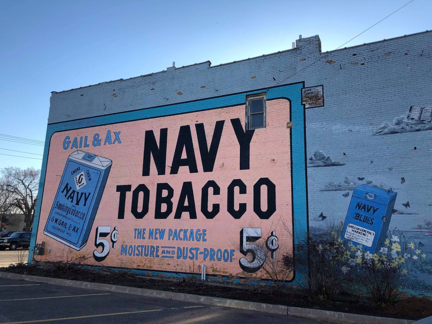 The giant wall is an advertisement for Gail & Ax Navy Tobacco, a company I don’t recall ever seeing behind gas station counters. A quick Google search lead me to the Antique Advertising Expert:
