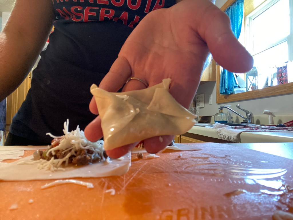 - Wet the edges of the wrapper lightly by dipping your finger into a bowl of water, this will help them stick together. fold all the corners into the center creating an envelope shape. I like to do opposite corners at the same time. Use a dab or two of water to seal loose edges.