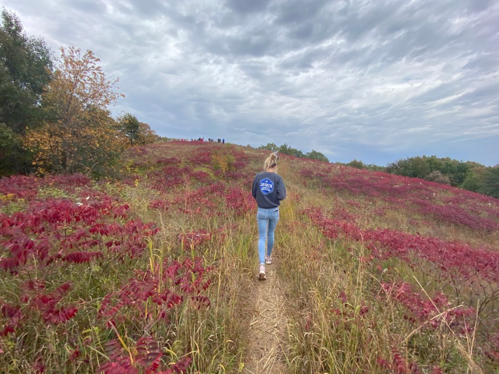We did the short walk up the hill and when we got to the top, we were greeted with a sea of green. The only real color was the vibrant red of the sumac that lined the trails. Kind of disappointing.