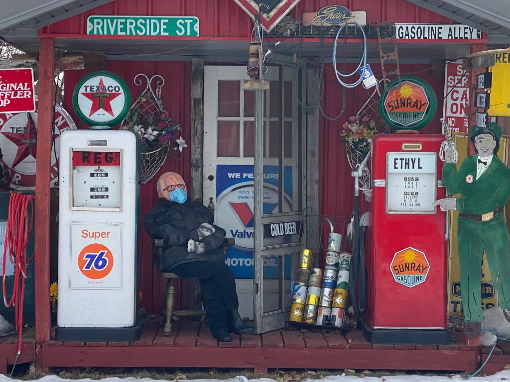 Now “Bernie” and his mittens are hanging out on St. Cloud’s east side. This real-life remake of a meme is set up as part of a mock gas station yard display on Riverside Drive SE. The elaborate display also includes numerous pieces of old gas station memorabilia and fun vintage signs.