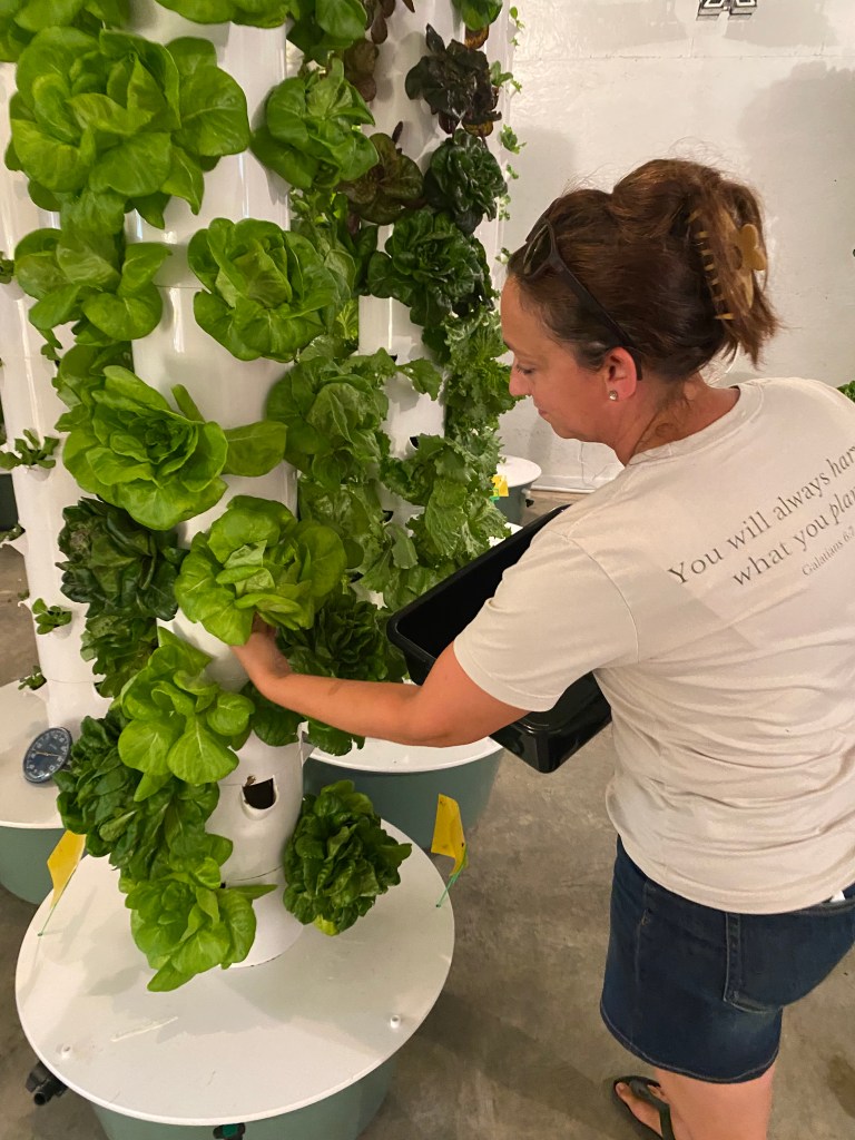 And the family element is a huge part of this operation. The tower farm itself started with just one tower to feed the Mays and their kids. Erin had some health issues during pregnancy and after evaluating the situation and doing research, she purchased a tower garden for her family, knowing they needed more vegetables in their diets. One successfull garden for their family has turned into a garage stall full, and a thriving business. And with the kids being homeschooled by Erin she is using the farm as a teaching tool.